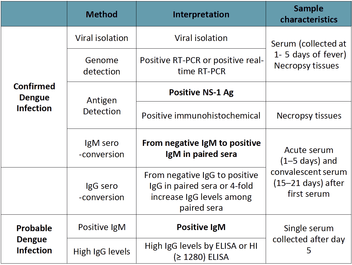 - Detection of dengue virus or antigen in tissue, serum or cerebrospinal fluid by immunohistochemistry, immunofluorescence or enzyme-linked immuno-sorbent assay.