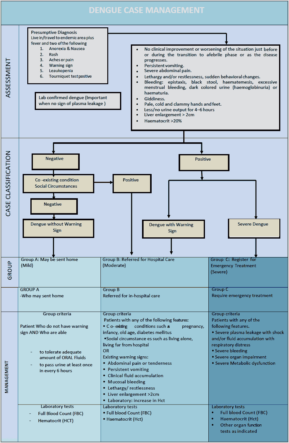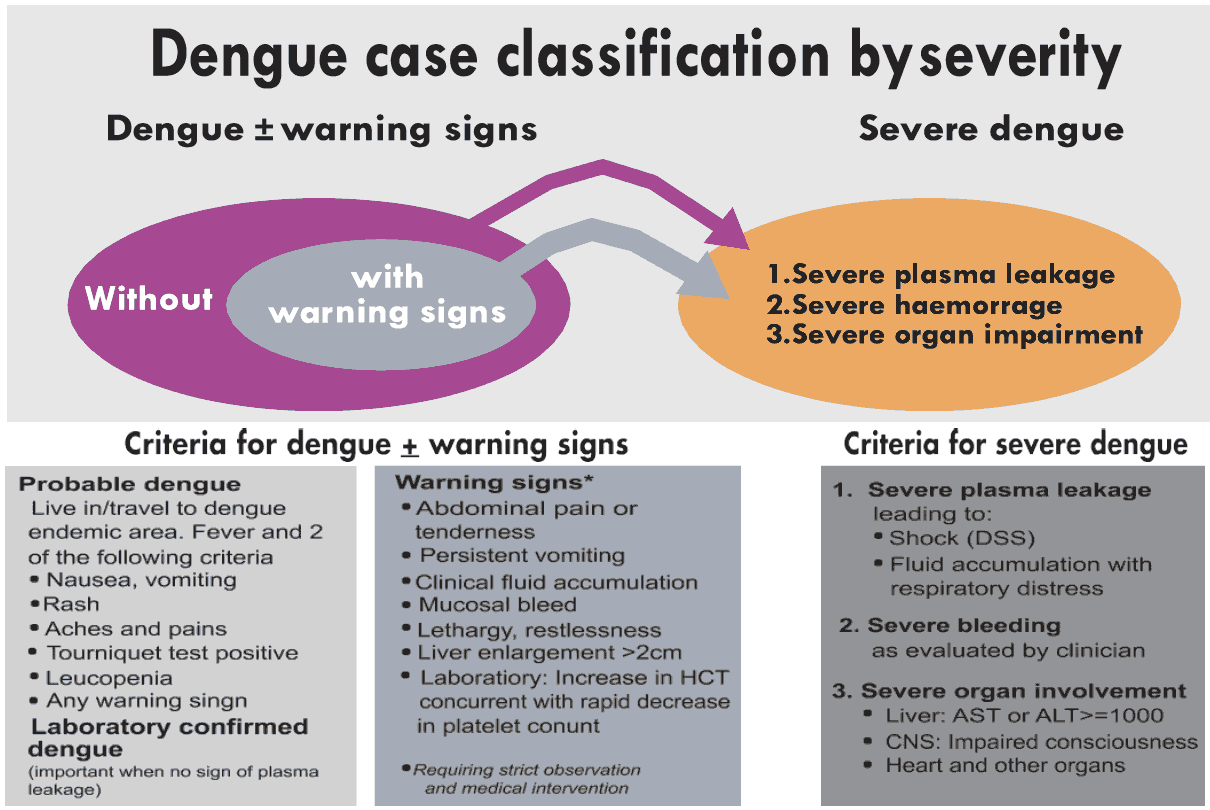 Changes in the epidemiology of dengue, especially with an increasing number of cases in adults (with and without co-morbidities) and the expansion of dengue into other regions of the world, has led to problems with the use of the existing WHO classification. This clinical guide uses three categories for case management (A, B, C) based on the model of case classification that follows (Figure 10) after a patient has fulfilled the criteria for probable dengue.