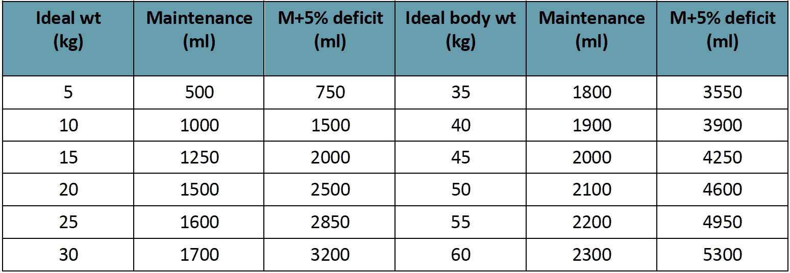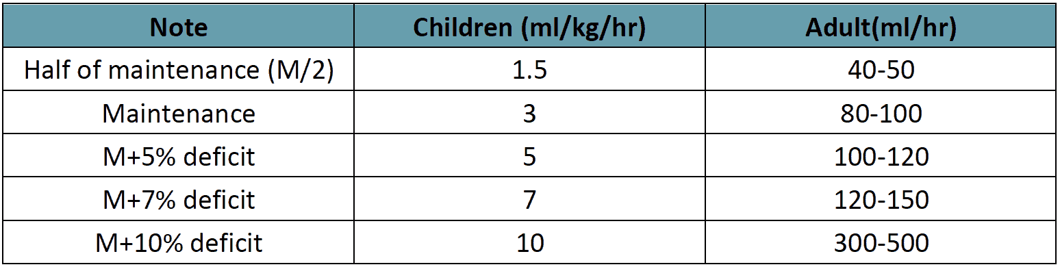 Example: In a child weighing 10 kg, the bolus fluid should be (10 x 10) = 100 ml over 30 min (50 drops/min). When patient becomes vitally stable, fluid should be continued @ 10 ml/kg/hr (10x10) = 100ml/ hr (25 drops/min). If improves, reduction should be done @ 7ml/kg/hr (7x10) = 70 ml/hr (18 drops/min), Then 5 ml/kg/hr (5x10) = 50 ml/hr (12 μdrops/min) and subsequently like this.
