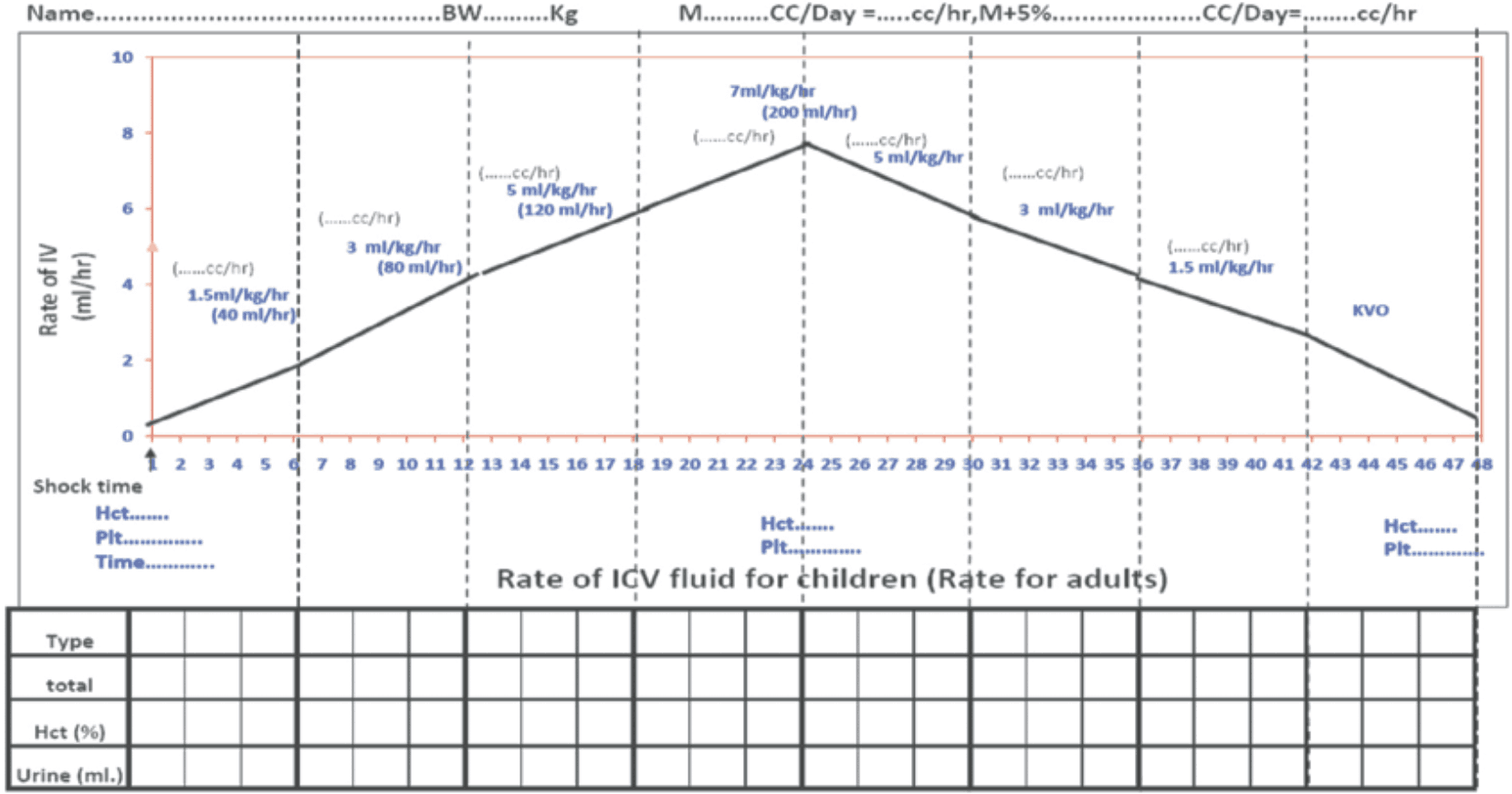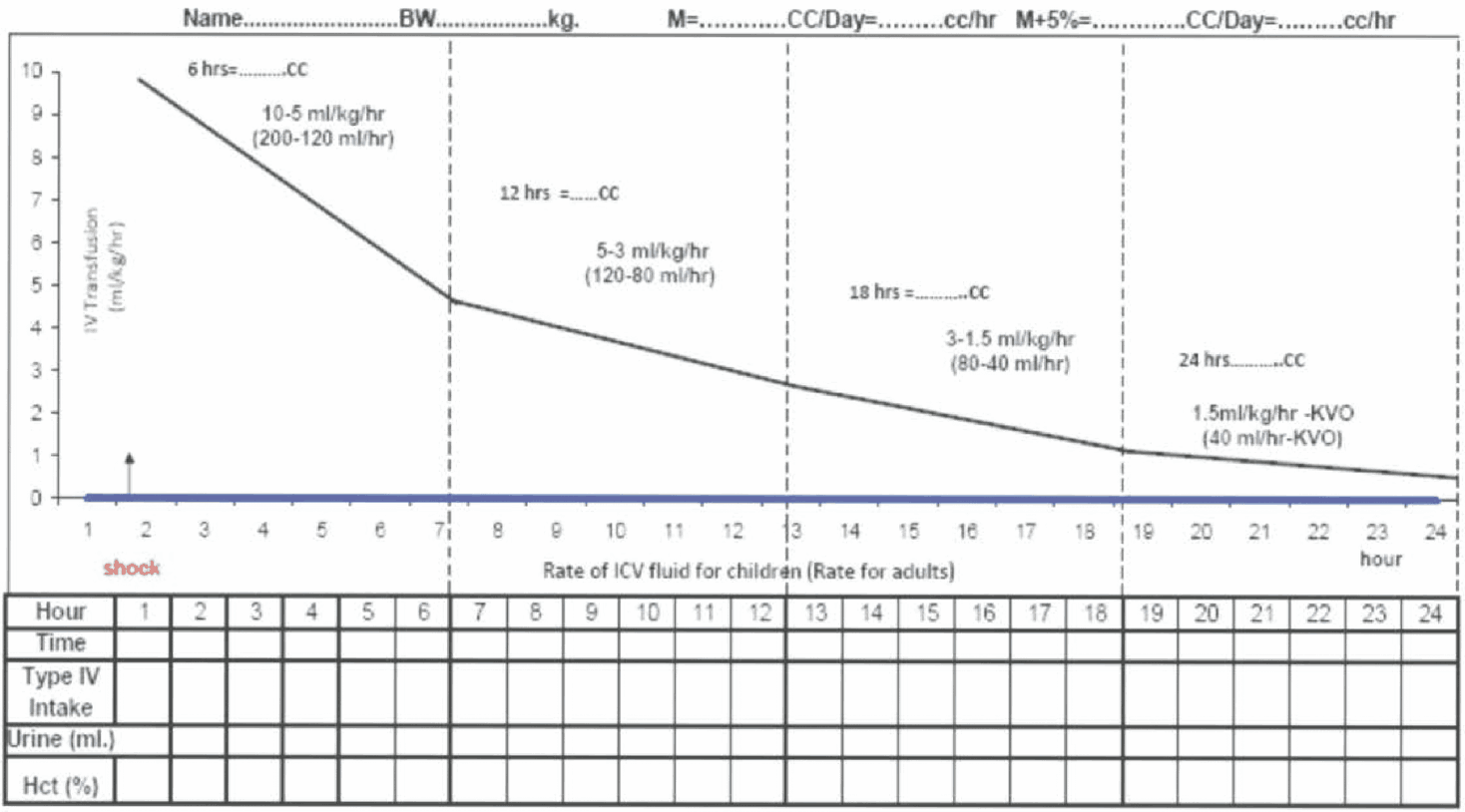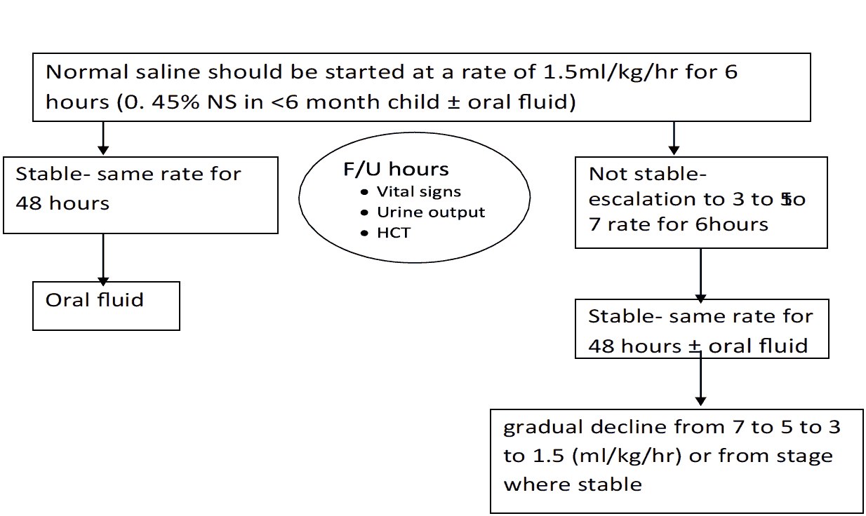 - If the vital signs and HcT improved, the fluid can be reduced from 10 ml/kg/hr to 6ml/kg/hr for 2 hours, then from 6 to 3 ml/kg/hr for 2-4 hrs and then 3 to 1.5 ml/kg/hr for another 2-4 hrs. Fluid should be discontinued after 24-48 hrs.