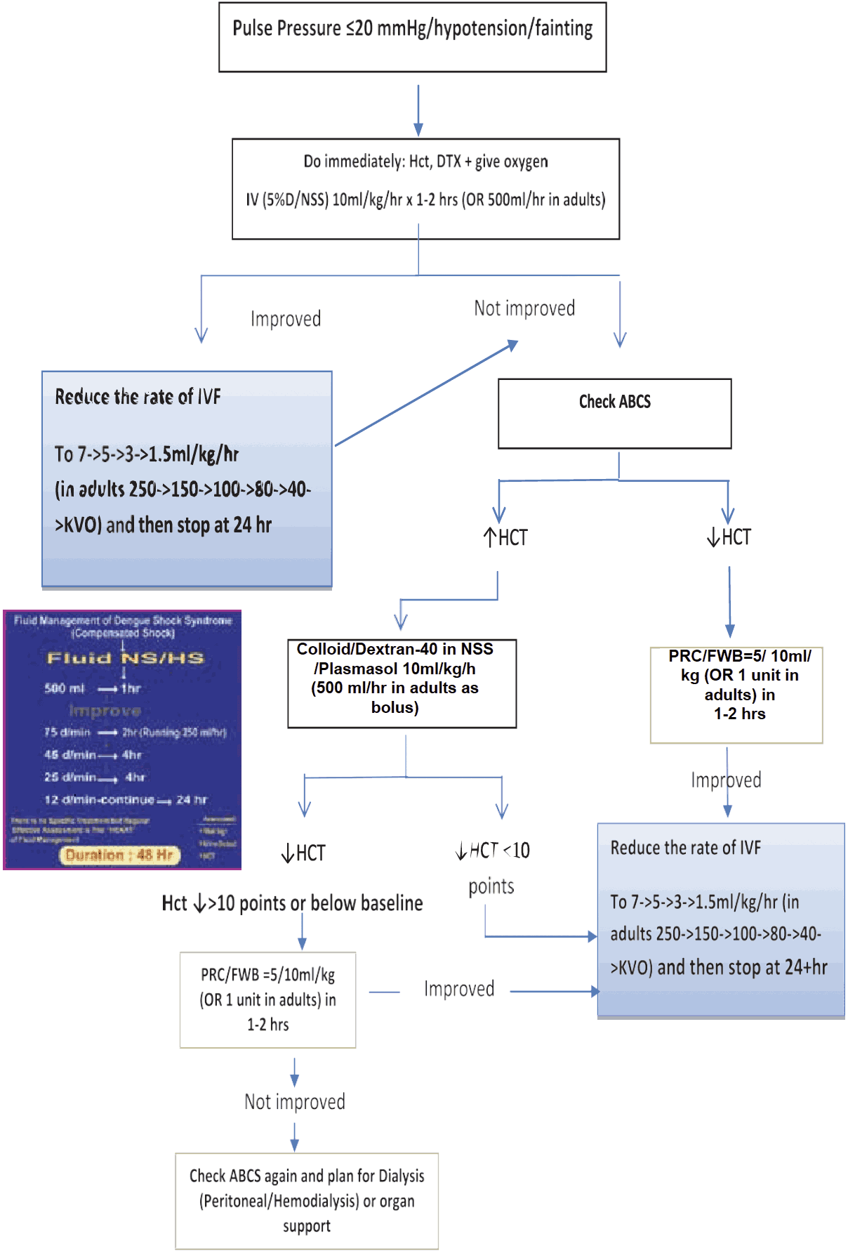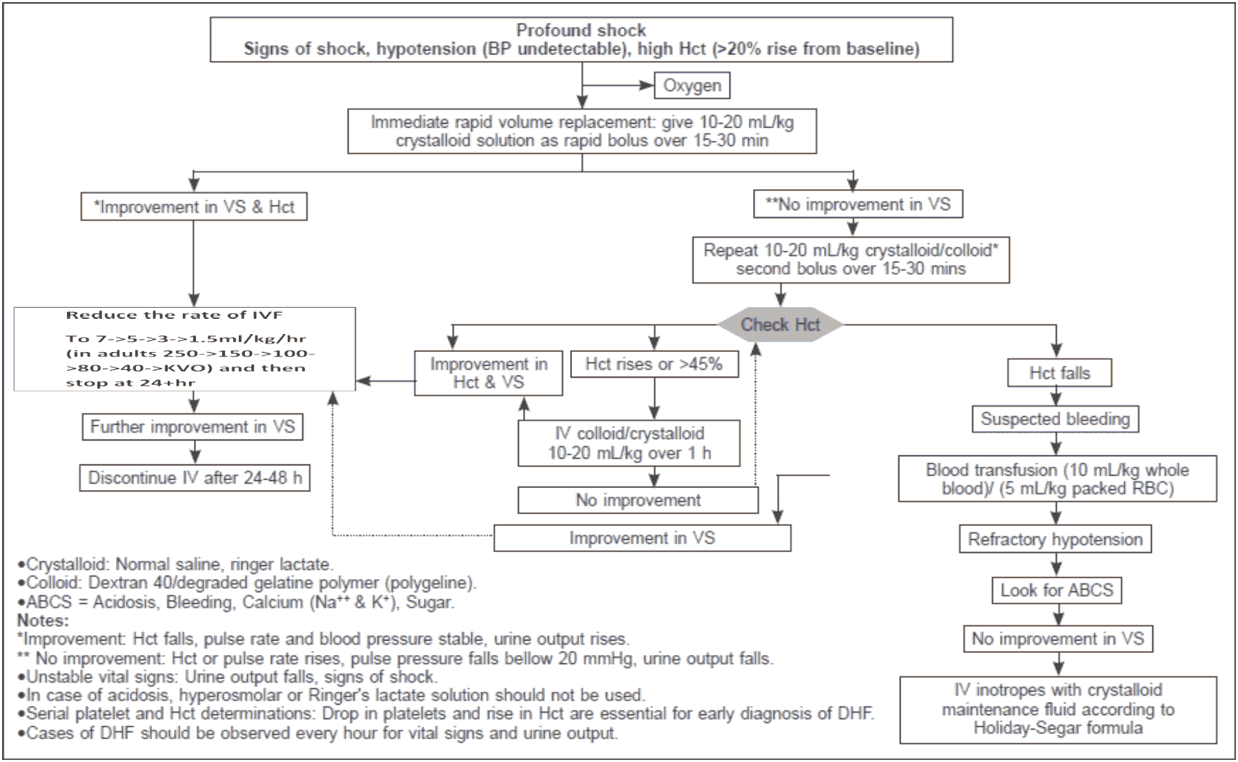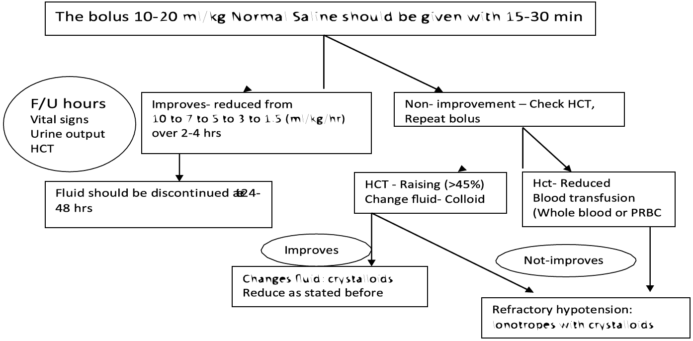 - If there is no clinical improvement after bolus crystalloids, check HcT. If the HcT is raising (more than 45%, then the fluid should be changed to colloid at (10- 20ml/kg/hr) and if there is improvement, then changes the fluid to crystalloids and successfully reduce as stated before. The highest dose of colloid will be 30 ml/kg/24 hour.