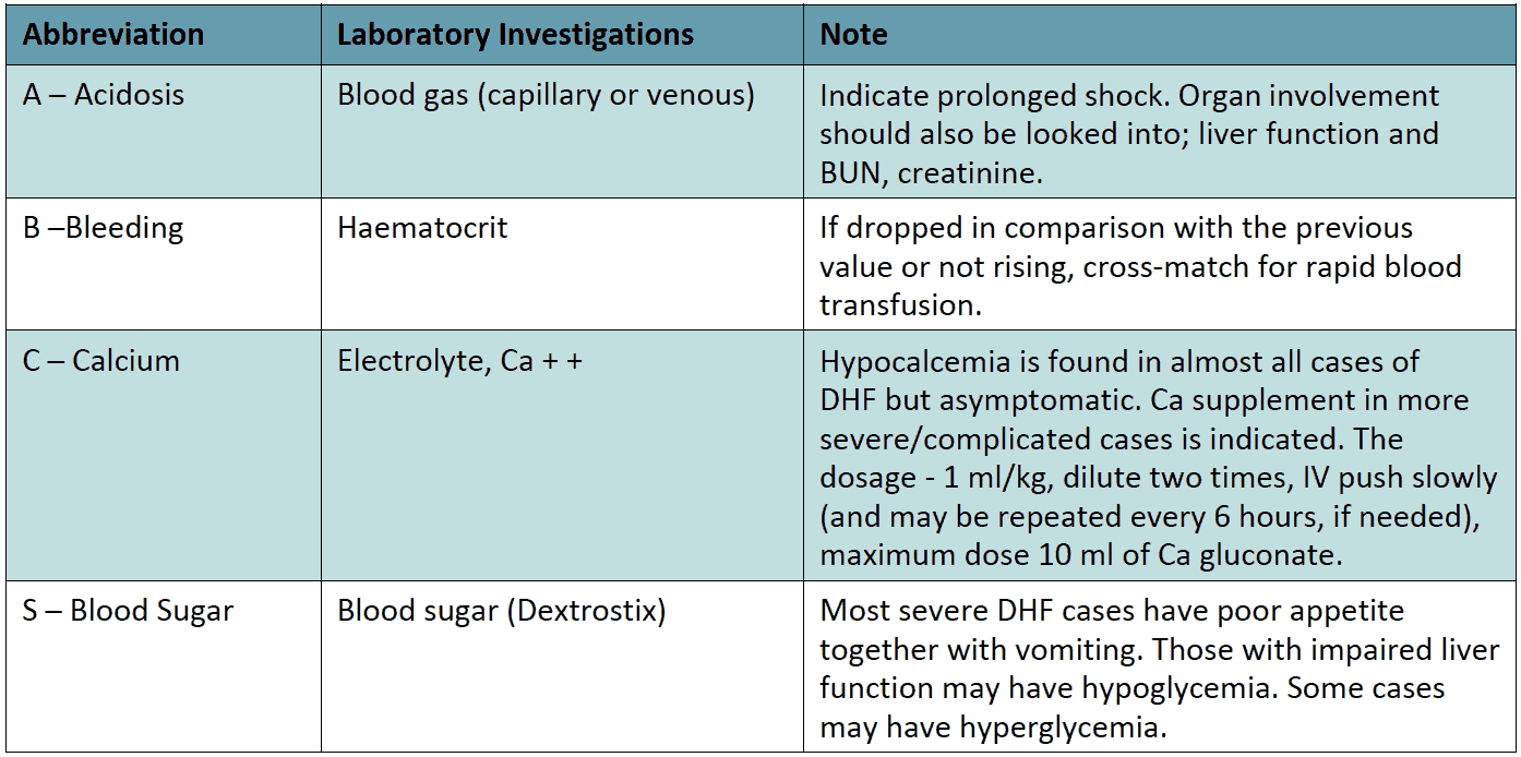Laboratory investigations (ABCS) should be carried out in both shock and non-shock cases when no improvement is registered in spite of adequate volume replacement