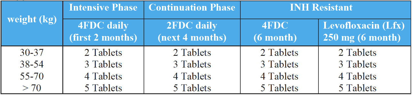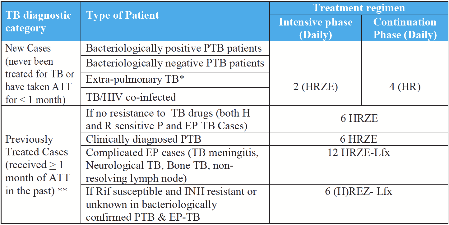 * Treatment for certain EP TB may be prolonged till 12 months if non-resolving lymph nodes at 6 months; 12 months in case of CNS, TB meningitis, bone TB etc.
