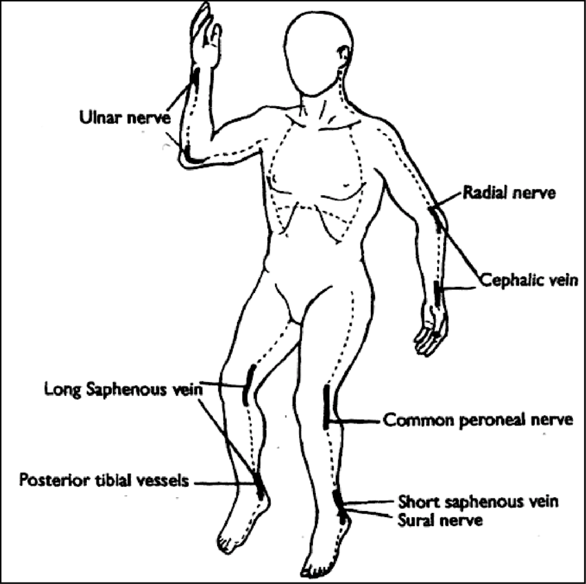 - Circumferential burns of the limbs and trunk require immediate bed side escharotomy (see diagram of the site of incisions)