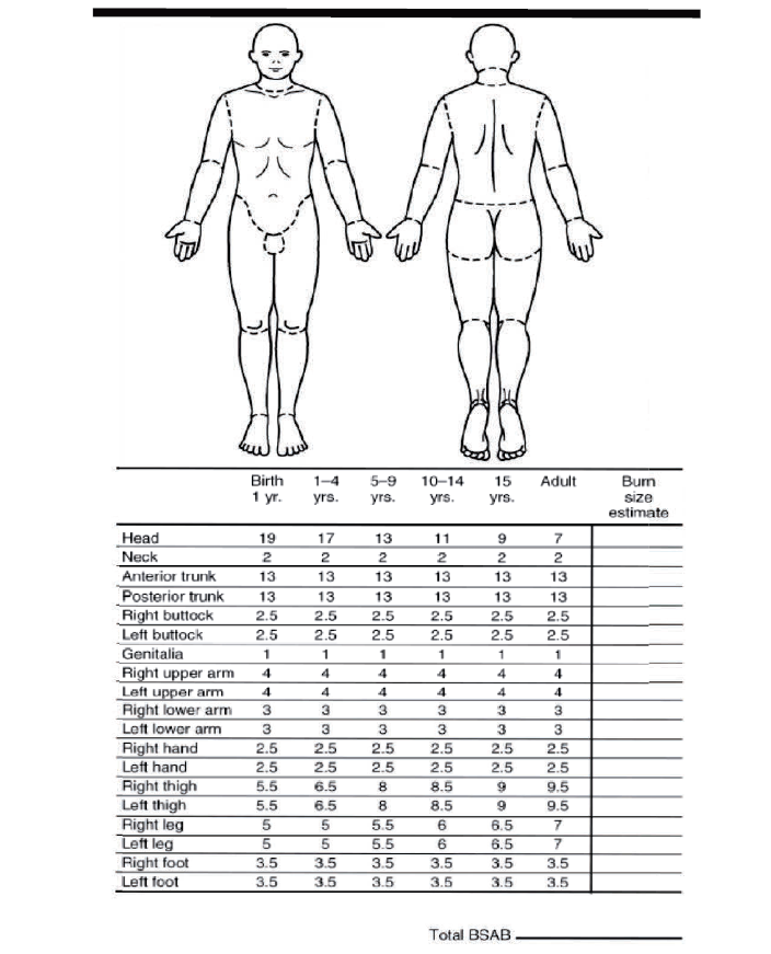 - Assess the % total body surface area using the paediatric Lund-Browder Chart, the palmar surface of the patient’s hand or the Wallace’s rule of nines chart (as adapted for children).
