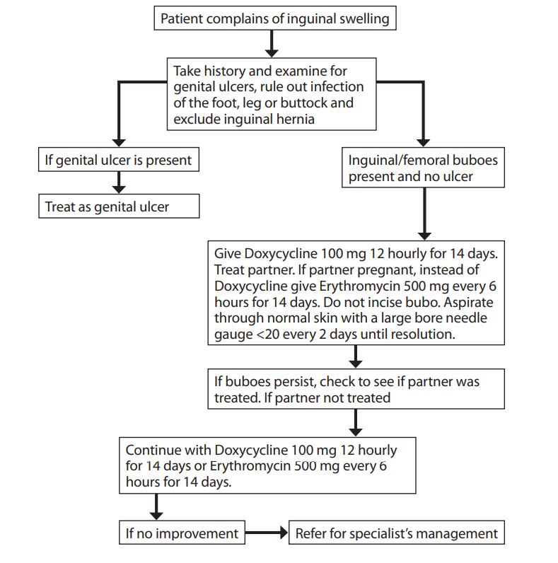 - Do not incise bubo. Aspirate through normal skin with a large bore needle gauge <20 every 2 days until resolution